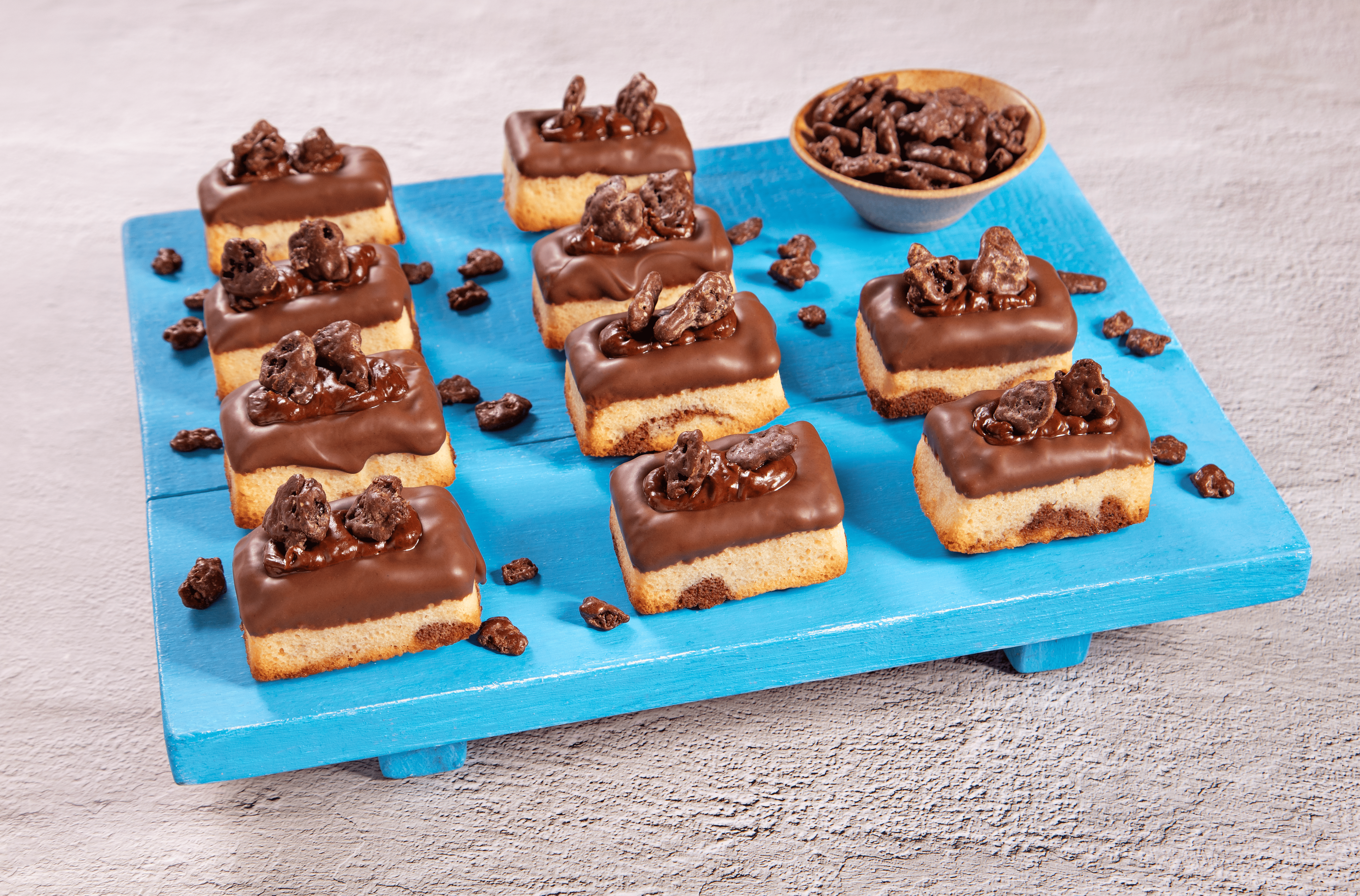 Banhe os financiers na cobertura de chocolate, recheie e finalize com Ovomaltine® Creme Crocante e Ovomaltine® Rocks;
