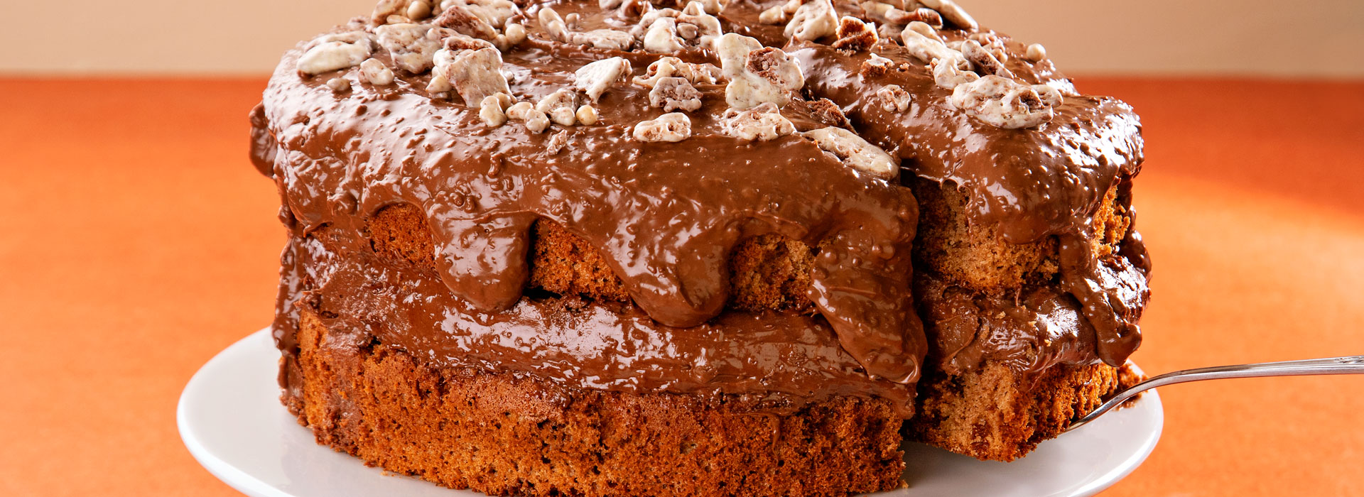 - Distribua o Ovomaltine® Creme Crocante sobre o topo do bolo (dica: para o creme escorrer na lateral, aqueça-o por 30 segundos e utilize imediatamente).