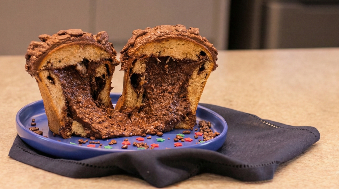 Depois de frio, corte a tampa do panetone, retire um pouco do miolo e recheie com o Ovomaltine® Creme Crocante.