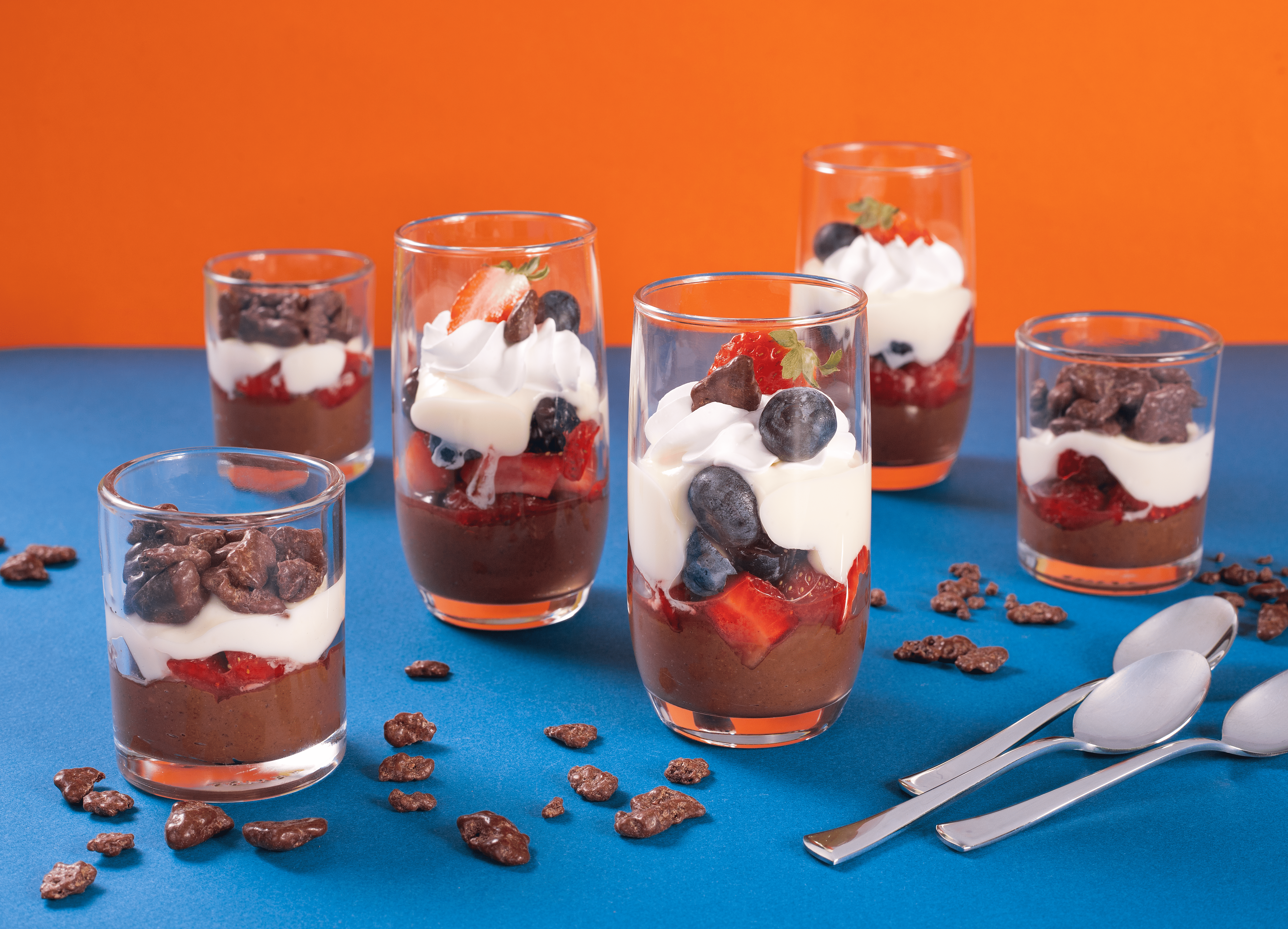 - 600 g de Ovomaltine® Creme Crocante; - 300 g de frutas vermelhas; - 340 g de iogurte natural; - 30 g de leite em pó integral; - 100 g de creme tipo chantilly batido; - 220 g de Ovomaltine® Rocks.